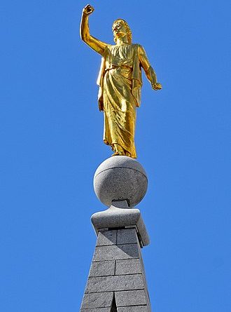 Feita de cobre martelado, coberto de folhas de ouro e pesando mais de uma tonelada, a estátua de quase quatro metros de altura foi colocada no pináculo de 64 metros de altura do Templo em 6 de abril de 1892, exatamente um ano antes da dedicação do Templo em 6 de abril de 1893.