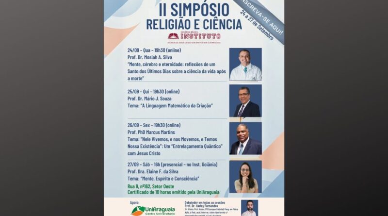 De acordo com a publicação do Instituto Goiânia em suas redes sociais, o evento será entre os dias 24 e 27 de setembro de 2025. O Simpósio é totalmente gratuito e reunirá professores e pesquisadores renomados para explorar as conexões entre o conhecimento científico e a espiritualidade.